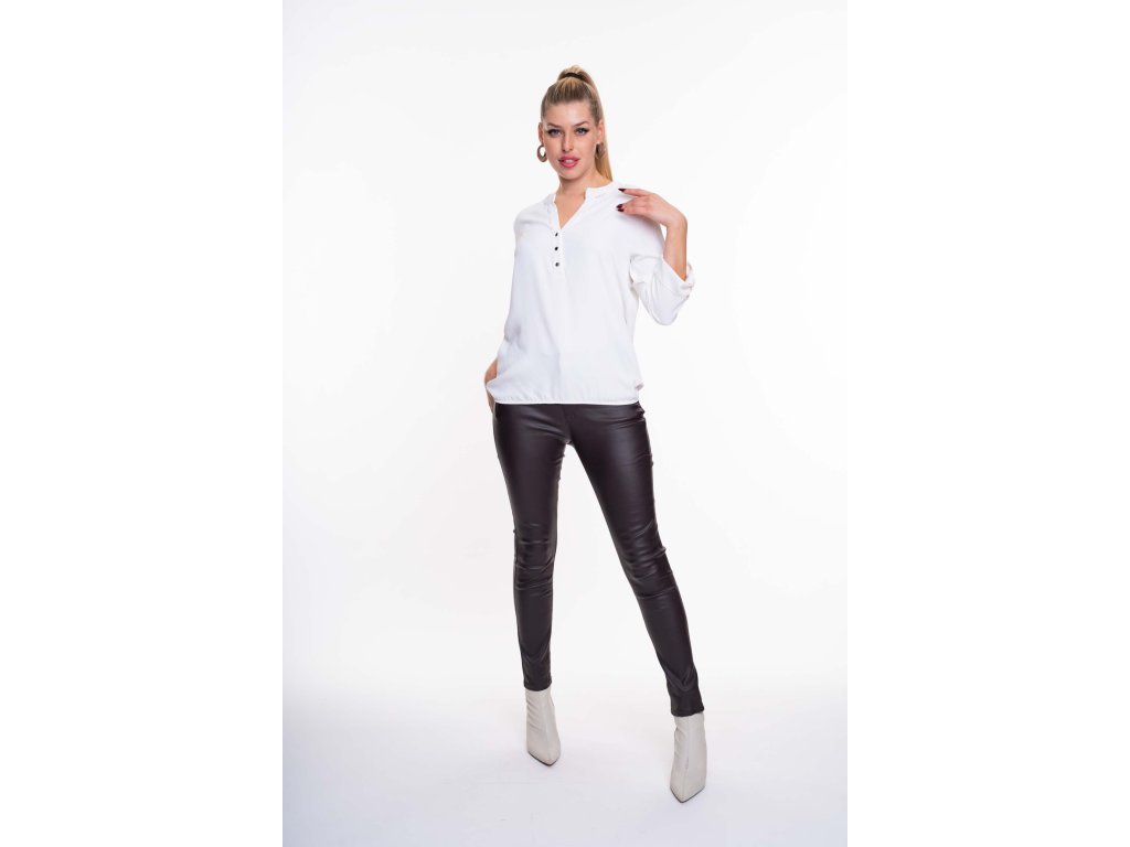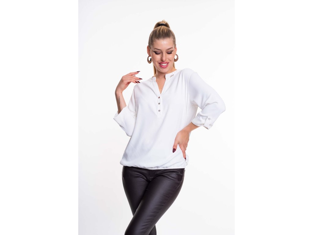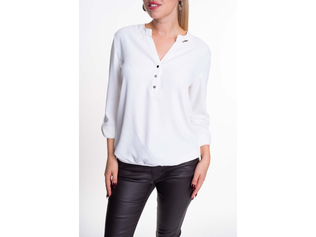 Volně střižená halenka s knoflíky vpředu, z mírně elastického materiálu, v dolní části stažená do gumy a s malým kovovým kamínkovým logem značkyMAYO CHIX na límečku.