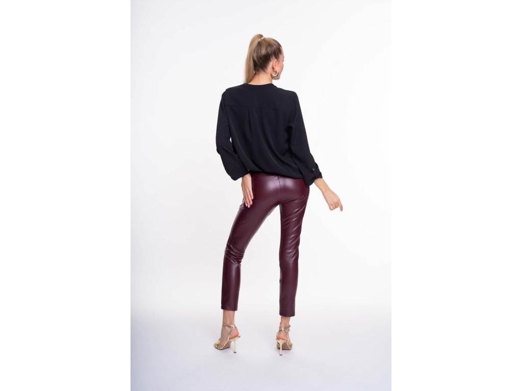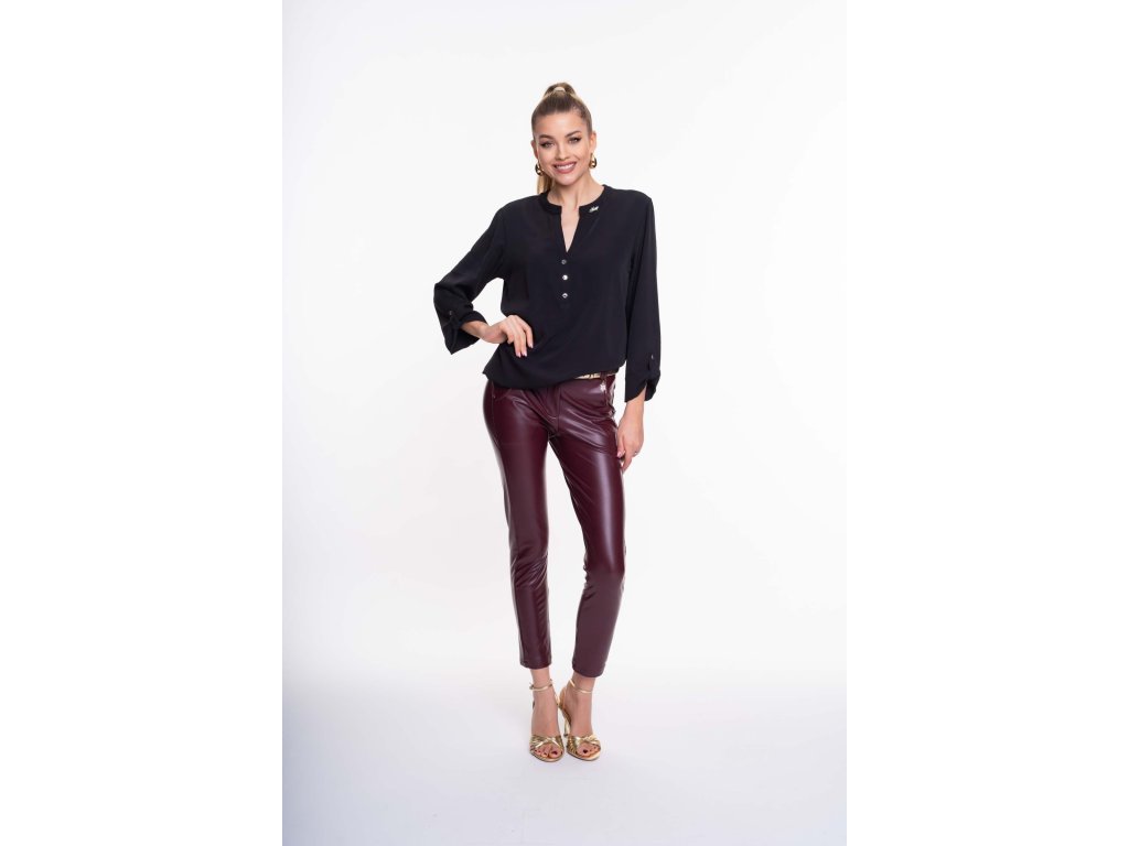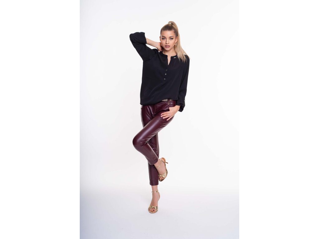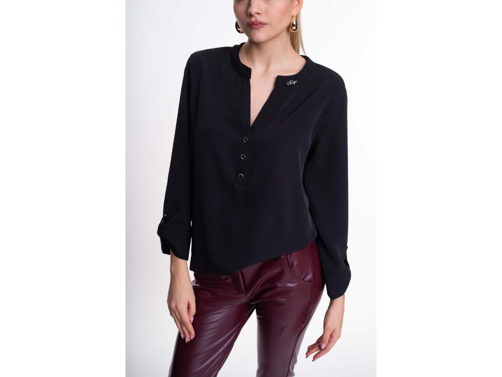 Volně střižená halenka s knoflíky vpředu, z mírně elastického materiálu, v dolní části stažená do gumy a s malým kovovým kamínkovým logem značkyMAYO CHIX na límečku.