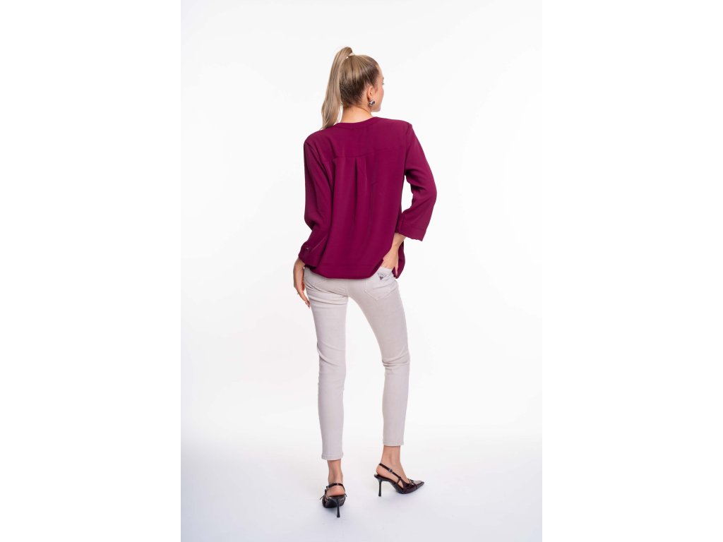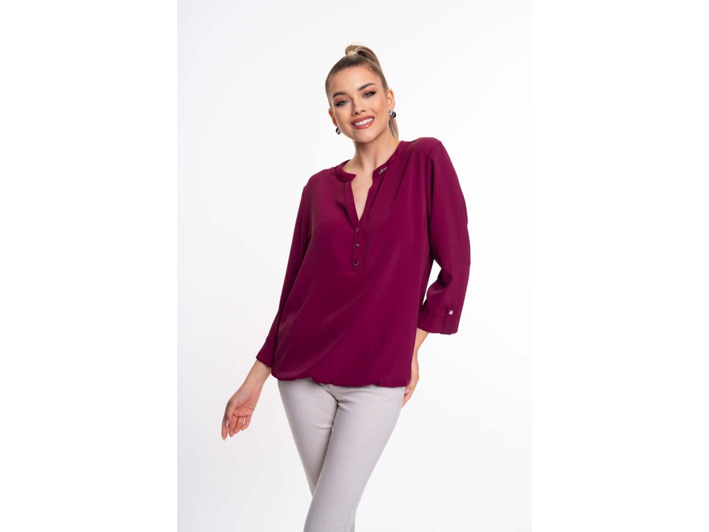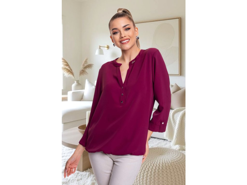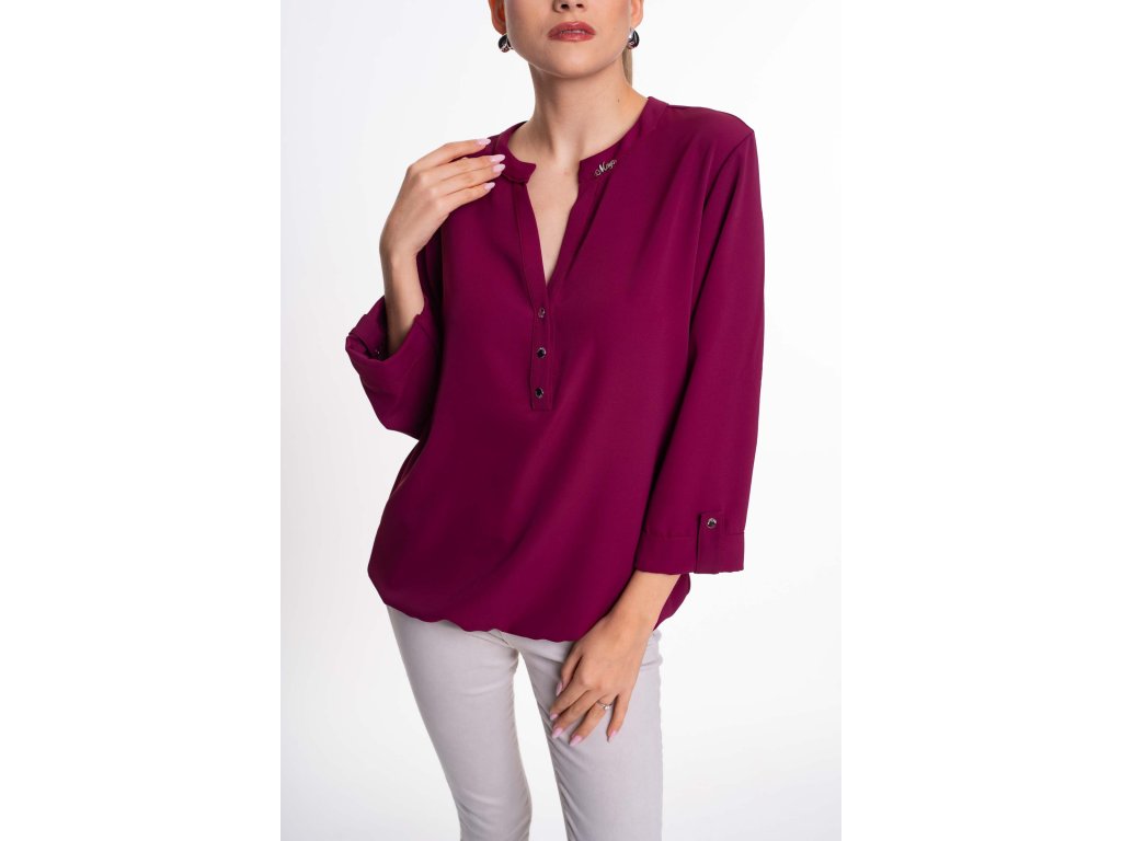 Volně střižená halenka s knoflíky vpředu, z mírně elastického materiálu, v dolní části stažená do gumy a s malým kovovým kamínkovým logem značkyMAYO CHIX na límečku.