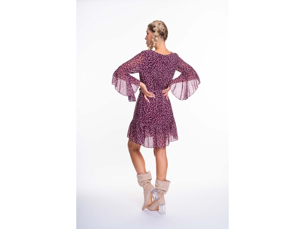 Šaty áčkového střihu z pevného žoržetového materiálu s podšívkou, s volánovými rukávy, páskem ze stejného materiálu v pase a malým kovovým logem značkyMAYO CHIX, které lze pro praní odepnout.