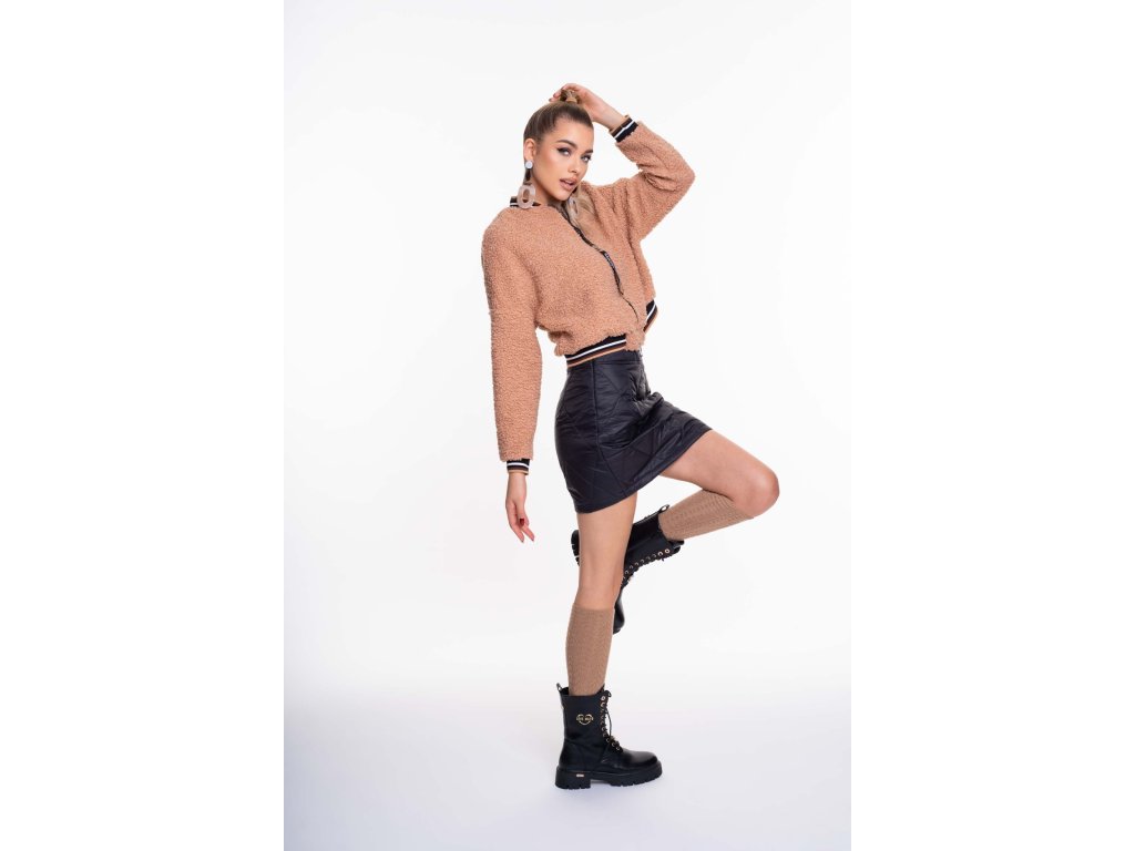 Krátký kabátek z elastického, silného buklé materiálu, s ozdobnými lemy a zipem.