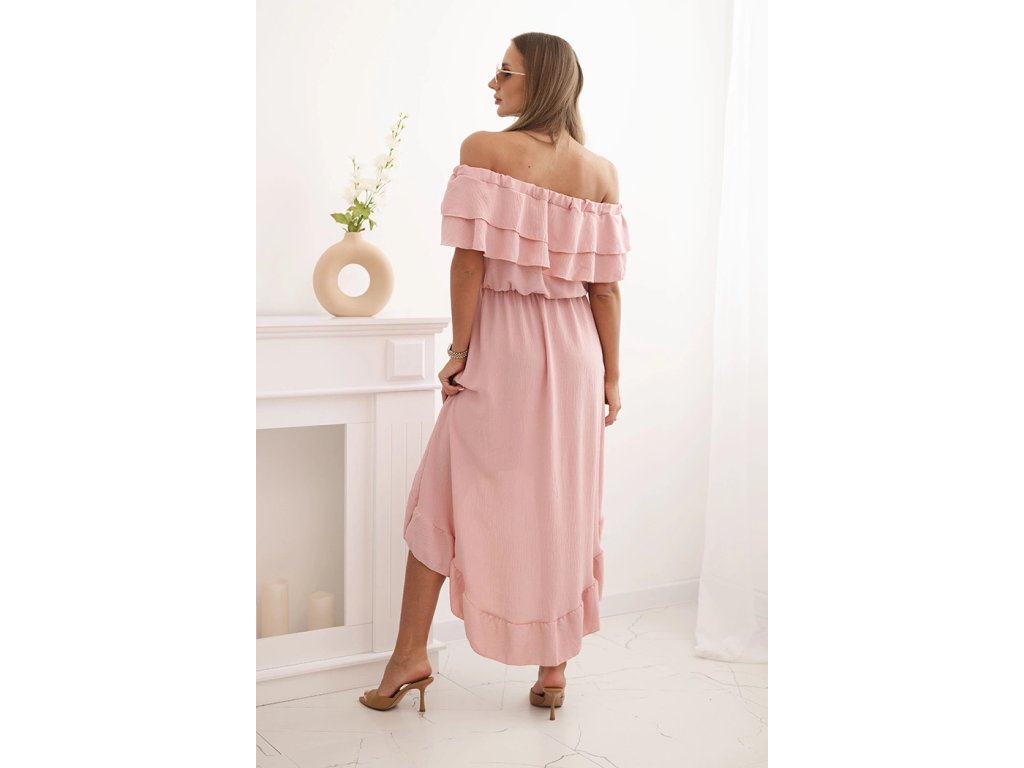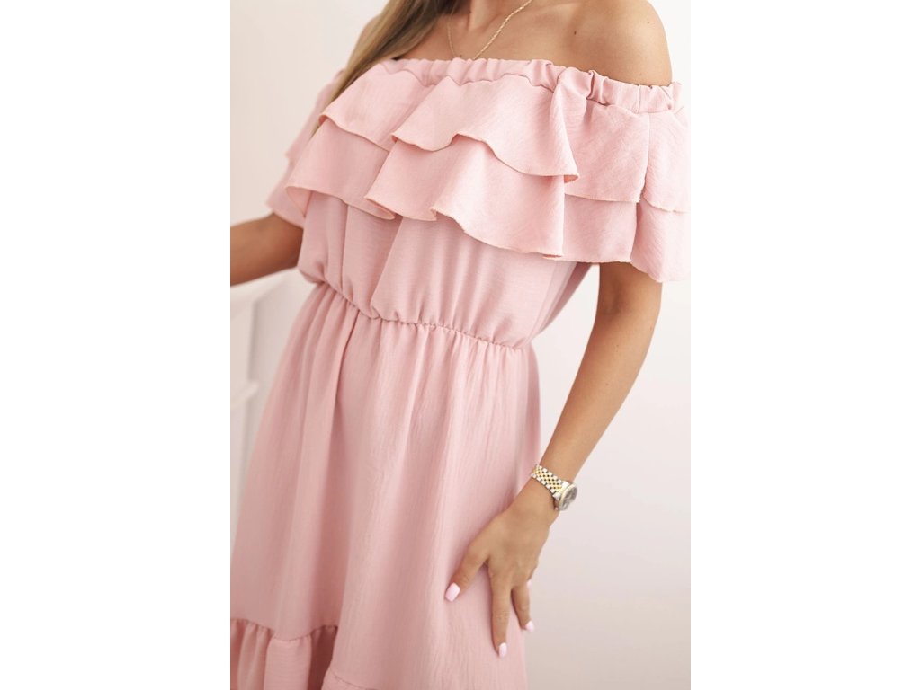 Tyto dámské šaty s odhalenými rameny jsou ztělesněním ženského stylu a letní elegance. Model s poutavými volánky kolem výstřihu dodává šatům romantický nádech a decentně odhaluje ramena, čímž vytváří výjimečně ženskou siluetu. Asymetrický lem dodává šatům lehkost a zaručuje úchvatný vzhled každého pohybu. Elastický pas dokonale obepíná postavu, zdůrazňuje ženské křivky a zajišťuje celodenní pohodlí. Jsou perfektní volbou na dovolenou, letní večírky, rande nebo venkovní akce. Díky kombinaci elegance a pohodlí se tyto šaty stanou vaším oblíbeným kouskem šatníku pro teplé dny. Velikost je univerzální a vhodná pro ženy ve velikostech S, M nebo L.