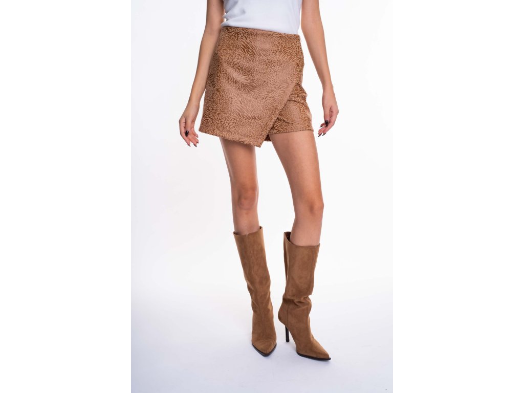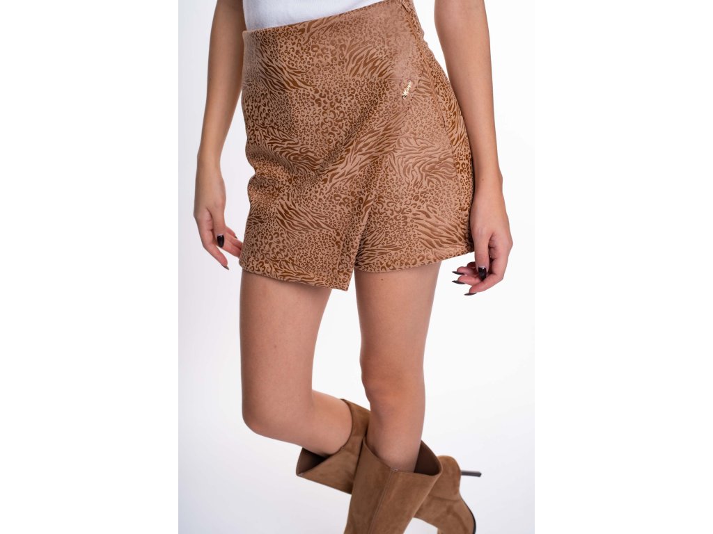 Šortky ze vzorovaného materiálu, s překládaným (zavinovacím) designem na přední straně, zapínáním na zip na boku a malým kovovým logem značky MAYO CHIX.
