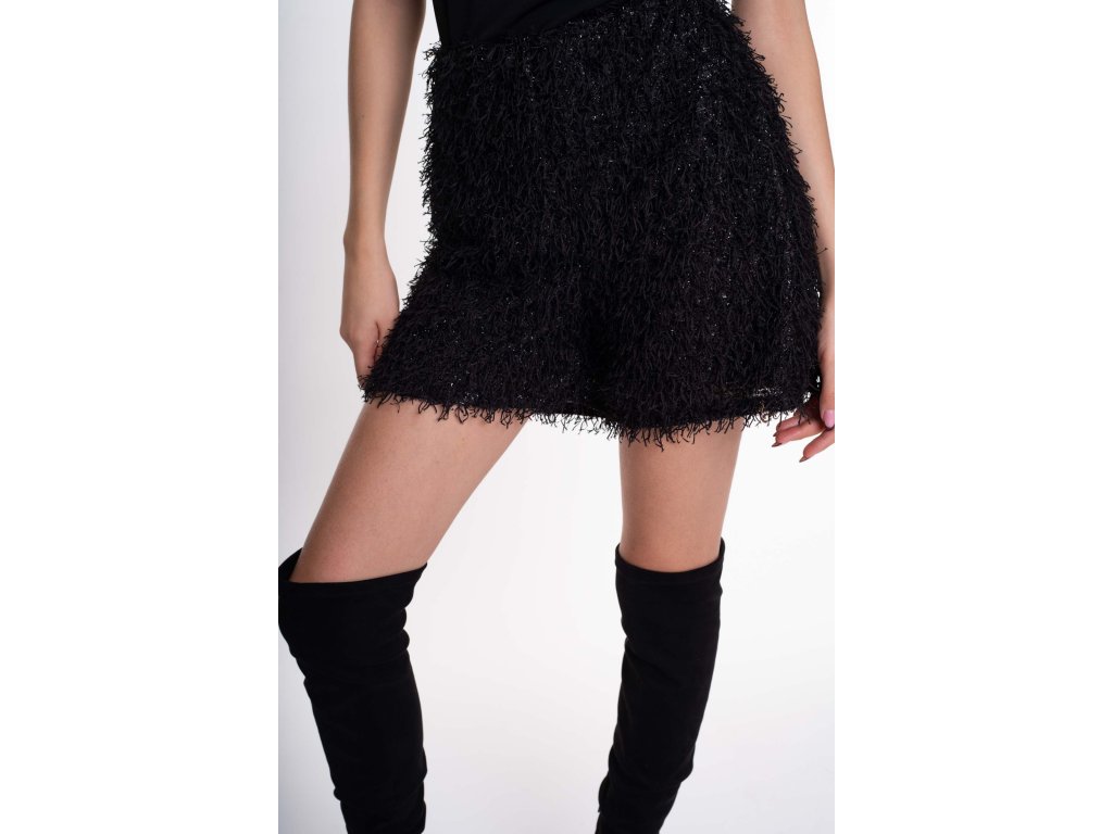 Šortky z mírně elastického, lesklého, třásnitého materiálu s elastickým pasem, podšívkou a malým kovovým logem značky MAYO CHIX.