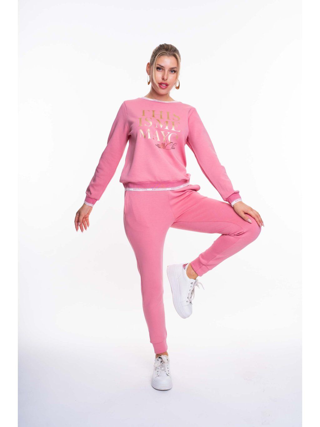Sportovní tepláková souprava z elastického materiálu, s elastickým pasem, kapsami na spodním dílu, mikinou v ležérním stylu a potiskem.